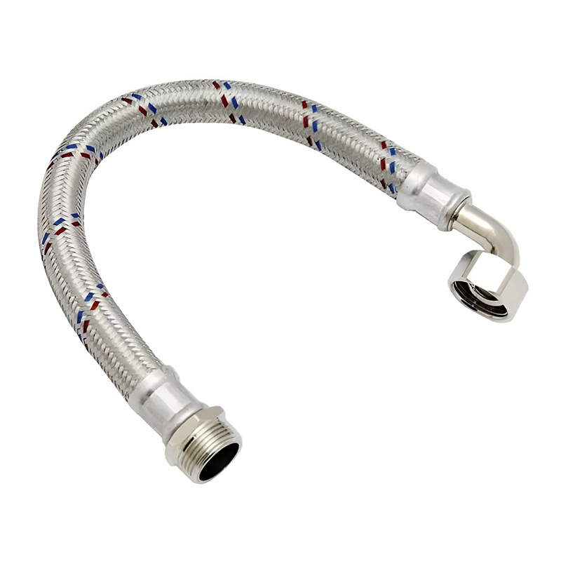 Зовнішнє армоване обплетення з нержавіючої сталі надає шлангу міцності, захищає від механічних пошкоджень і дозволяє витримувати перепади тиску, зберігаючи цілісність з'єднання навіть при тривалому навантаженні. Якісне обплетення з 7-ми ниток дозволяє підводці витримувати максимальний тиск 10 атм.