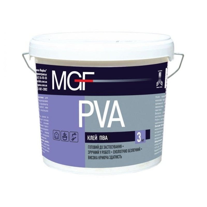 Клей ПВА MGF – поливинилацетатный, предназначен для внутренних работ. Назначение – надежное склеивание деревянных и керамических материалов, бумаги, поролона, тканей и кожи.