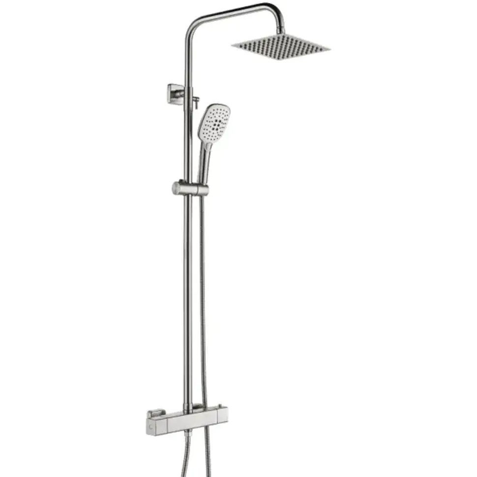 Модель оснащена термостатичним змішувачем, що автоматично підтримує стабільну температуру води, забезпечуючи безпеку та комфорт навіть при перепадах тиску в системі. В комплект входить верхній тропічний душ із рівномірним м'яким потоком та ручна лійка з двома режимами роботи, а також гнучкий шланг для зручності експлуатації.