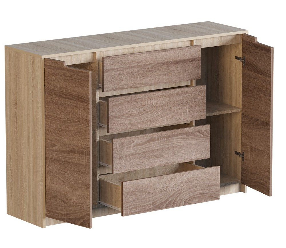 Має 4 великих висувних ящика і 2 секції з розстібними дверима. Матеріал виготовлення корпусу та фасадів комода - ламіноване ДСП, товщиною 16 мм, кромка ПВХ 0,5 мм. Комод дуже зручний та місткий, можна на вибір замовити висувний механізм: роликові та телескопічні напрямні.
