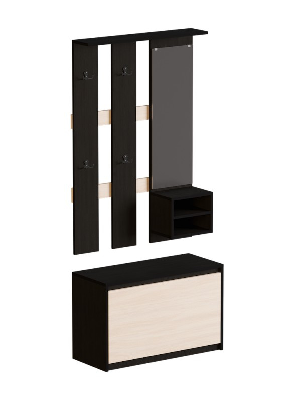 Не дивлячись на стиль мінімалізму, передпокій Мікс Тандем дуже місткий і універсальний. У комплект входить тумба для взуття на 2 секції, дзеркало, щит на 4 гачки і 2 полички для зберігання дрібниць і ключів. Матеріал виготовлення корпусу та фасадів передпокою - ламіноване ДСП, товщиною 16 мм, кромка ПВХ 0,5 мм.