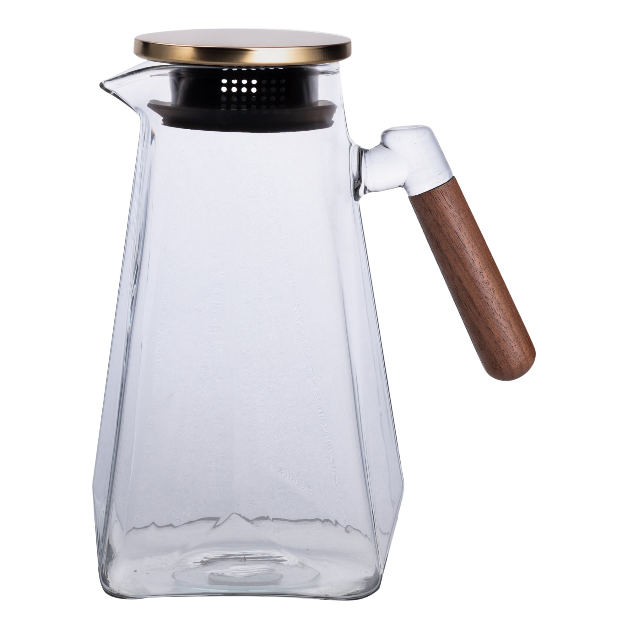 Кришка має фільтр із нержавіючої сталі, який затримує чайки та шматочки фруктів. Чайник має зручну дерев'яну ручку, яка унеможливлює обпектися. Прозорі стінки дозволяють спостерігати, як відкривається чайний лист, що додає естетичності чаювання.