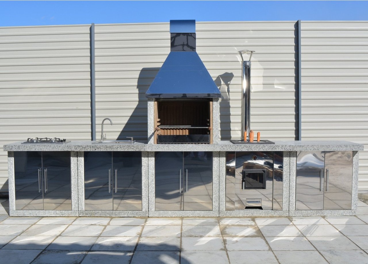 ТОВАР ТЯЖЕЛЫЙ! Перед оформлением заказа - уточняйте стоимость доставки. Мангальная зона барбекю «Гарден Шеф» с фасадами комплекс 2XL – это прекрасная покупка для вашей дачи. Сделанный из высококачественного бетона в стиле фактурной крошки, уличный барбекю прост в эксплуатации и сборке. Важным аргументом выбора барбекю в стиле фактурной крошки является его демократическая цена. Так же, такое исполнение печи не требует окрашивания. Произведен только на лучшем экологически чистом, европейском сырье. В комплекте идут специальные жаростойкие плиты из шамотного камня, выдерживающие температуру до 1300 градусов, что позволит использовать дрова, уголь и другое высокотемпературное топливо. Самый большой ассортимент в Украине. Доставим в любую точку Украины. Срок годности более 50 лет. Характеристики: ???? Глубина: 59 см; ???? Ширина: 405 см; ???? Общая высота: 235 см; ???? Вес: 1865 кг; ???? Высота столешницы: 85 см; ???? Размер гриля: 60*40 см; ???? Тип топлива: дрова, древесный уголь; Комплектация: Комплект плит барбекю; Комплект плит стола -3шт; Дымосборник из нержавеющей стали (пищевая AISI 304); Плиты шамота подового; Комплект огнеупорных плит; Заслонка для углей из нержавейки; Рамка для шампуров и сетки; Комплект бетонных плит печи тандыр; Сварная металическая основа; Комплект огнеупорных плит (шамот); Комплект чугунных колец; Пластина для шампуров; Фурнитура для сборки; Инструкция по сборке и эксплуатации. Дополнительные опции: керамогранит на столешницу: +11300 грн; фасады (дверцы): +16500 грн; доводчики на фасады: +1500 грн; зольный ящик + колосниковая решетка: +3900 грн; *Вид изделий и цвет - может незначительно отличаться от представленных на фотографиях. **Мелкие сколы, воздушные раковины на бетоне не являются браком и ни как не повлияют на эксплуатацию.