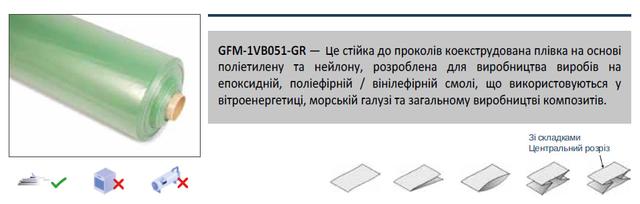 Вакуумна плівка 1VB051-GR виготовлена на основі поліетилену та нейлону і призначена для використання у вакуумній інфузії при виробництві композитних виробів. Матеріал стійкий до проколів, має високу гнучкість та знижене чуття до низького рівня вологості, що є особливо важливим для плівок на нейлоновій основі.