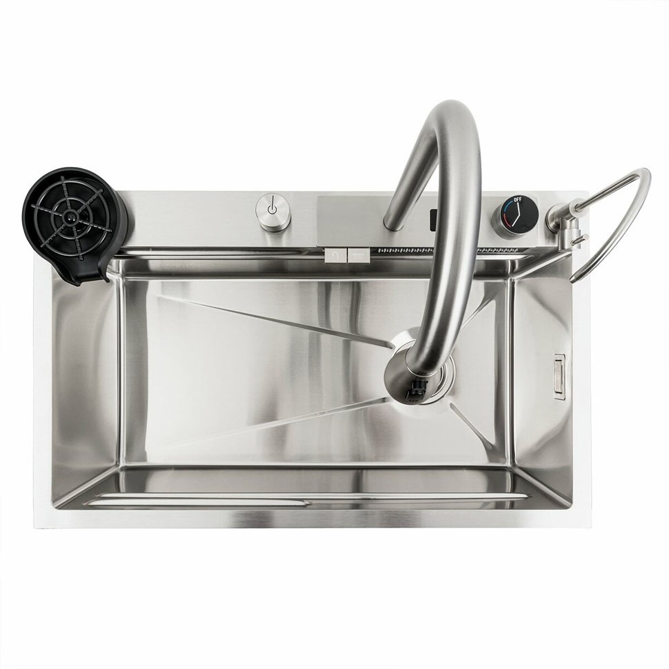 Габарити миття становлять 750×450 мм, глибина чаші близько 220 мм, що дозволяє комфортно мити навіть великий посуд. Модель оснащена вбудованою системою водоспадного типу, що забезпечує м'яку та спрямовану подачу води по задній стінці, що особливо зручно при ополіскуванні посуду або продуктів. В комплект входять змішувач, додатковий кран для питної води, вбудований ополіскувач для склянок, обробна дошка, металева сушка, підставка для овочів та фруктів, сифон із системою переливу, а також всі необхідні кріплення. Миття призначене для врізного монтажу, має продумане компонування та безліч вбудованих функцій, що робить її повноцінною робочою зоною на кухні. Platinex Handmade 75×45G Водоспад у сатиновому виконанні – це оптимальний вибір для тих, хто цінує комфорт, якість та сучасний дизайн.