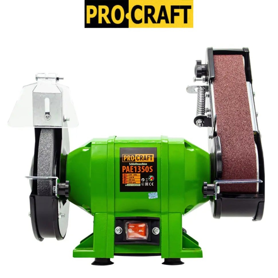 Електричний точильний верстат Procraft PAE1350S – універсальне обладнання для побутового застосування, за допомогою якого можна виконувати заточування різного інструменту, видаляти задирки, проводити обробку ручного інструменту. Пристрій оснащений абразивним диском з діаметром 150 мм та шліфувальною стрічкою. Обладнання працює від асинхронного двигуна потужністю 250 Вт (2800 оборотів за хвилину). Завдяки масивному металевому корпусу точило має стійкість до пошкоджень, довговічність. Стійкість інструменту забезпечується завдяки можливості кріплення до столу.
