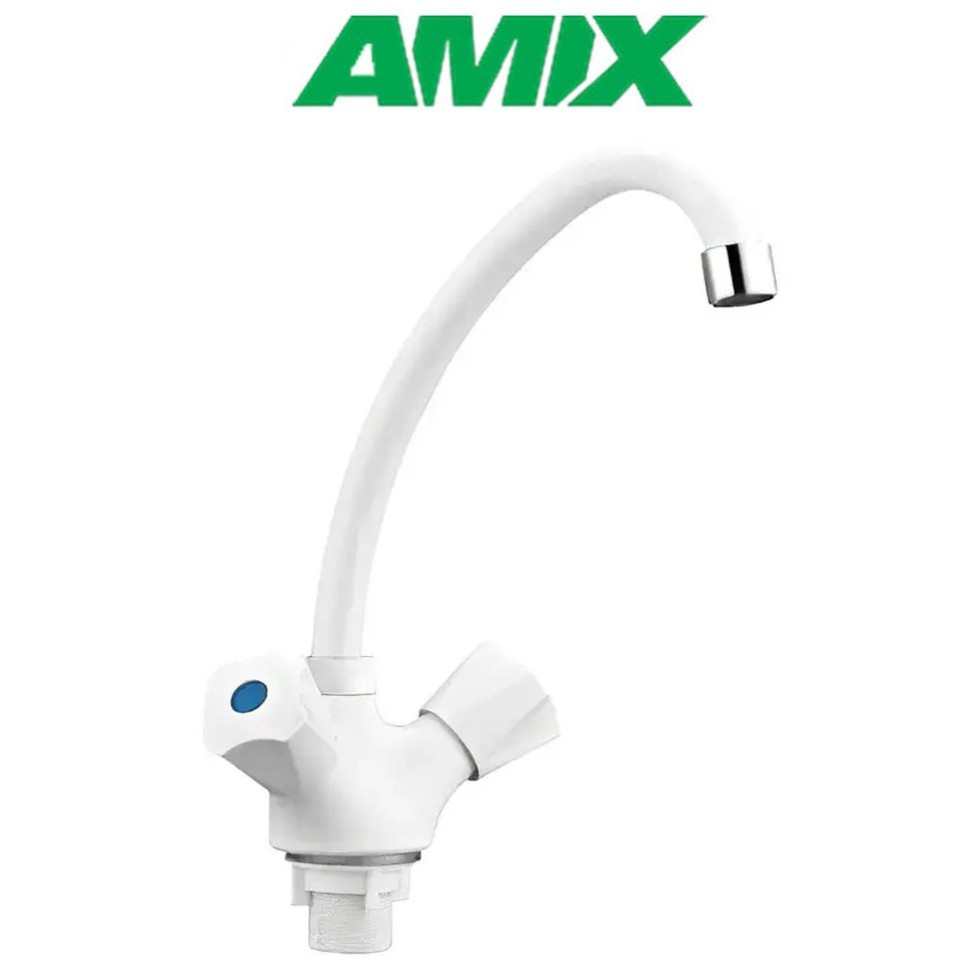 Змішувач для кухні AMIX Omega-271 White - це двовентильний змішувач, виготовлений з термопластику, стійкого до корозії та дії хімічних речовин. Він не темніє з часом і легко очищується. Змішувач монтується на мийку, стільницю або підвіконня через один отвір за допомогою гайки. Поворотний вилив довжиною 170 мм забезпечує зручність у використанні. Запірний елемент представлений керамічними напівоборотними кран-буксами (180 °). Гнучка підводка в комплект не входить і купується окремо