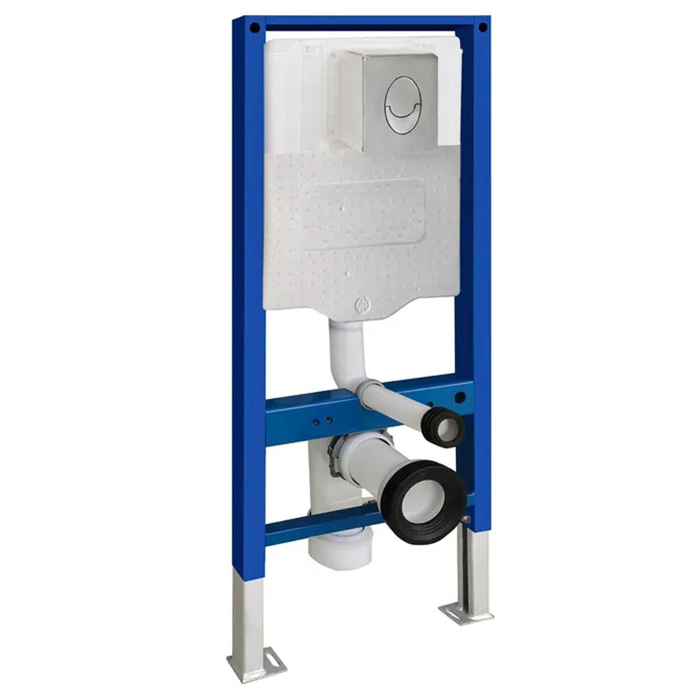 Комплект установочний для унітазу KT-0503-01 є системою інсталяції для підвісного унітазу, що включає пневматичну панель змиву. Панель змиву KT-0606-01 виготовлена із пластику, оснащена квадратною кнопкою у кольорі хром. Інсталяція призначена для прихованого монтажу підлоги і сумісна з різними моделями унітазів. Об'єм бачка становить 9 літрів, з можливістю налаштування малого та великого зливу для економії води. Конструкція включає три горизонтальні траверси та латунні різьбові з'єднання, забезпечуючи надійність та довговічність. Підключення води можливе зліва, ззаду або зверху, що підвищує універсальність установки. Розміри виробу становлять 1150 мм заввишки, 500 мм завширшки і 126 мм завглибшки, з можливістю регулювання монтажної висоти від 1150 мм до 1350 мм.