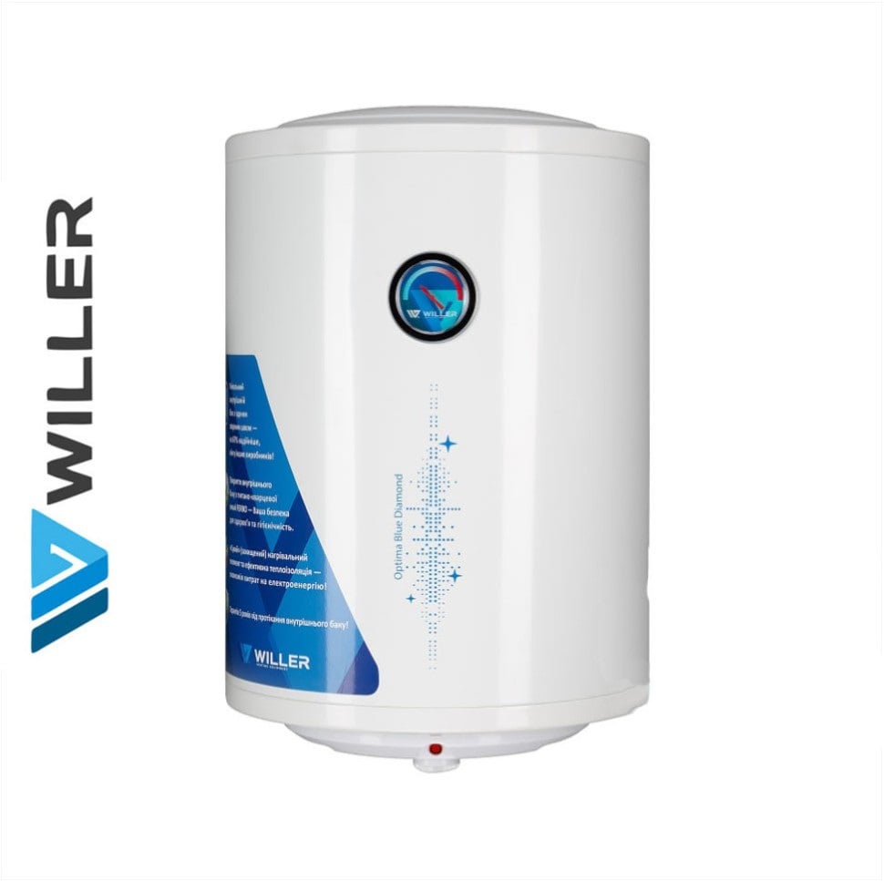 Willer EV50DR Optima – надійний накопичувальний електричний бойлер циліндричної форми об'ємом 50 літрів. Оснащений двома захищеними (сухими) нагрівальними елементами загальною потужністю 1,5 кВт. ТЕНи захищені від води спеціальним кожухом з емальованим покриттям, що дозволяє продовжити термін служби нагрівальних елементів та бойлера. Внутрішній бак виготовлений із сталі, покритої титанокварцевою емаллю, та захисний магнієвий анод забезпечують тривалий термін експлуатації.
