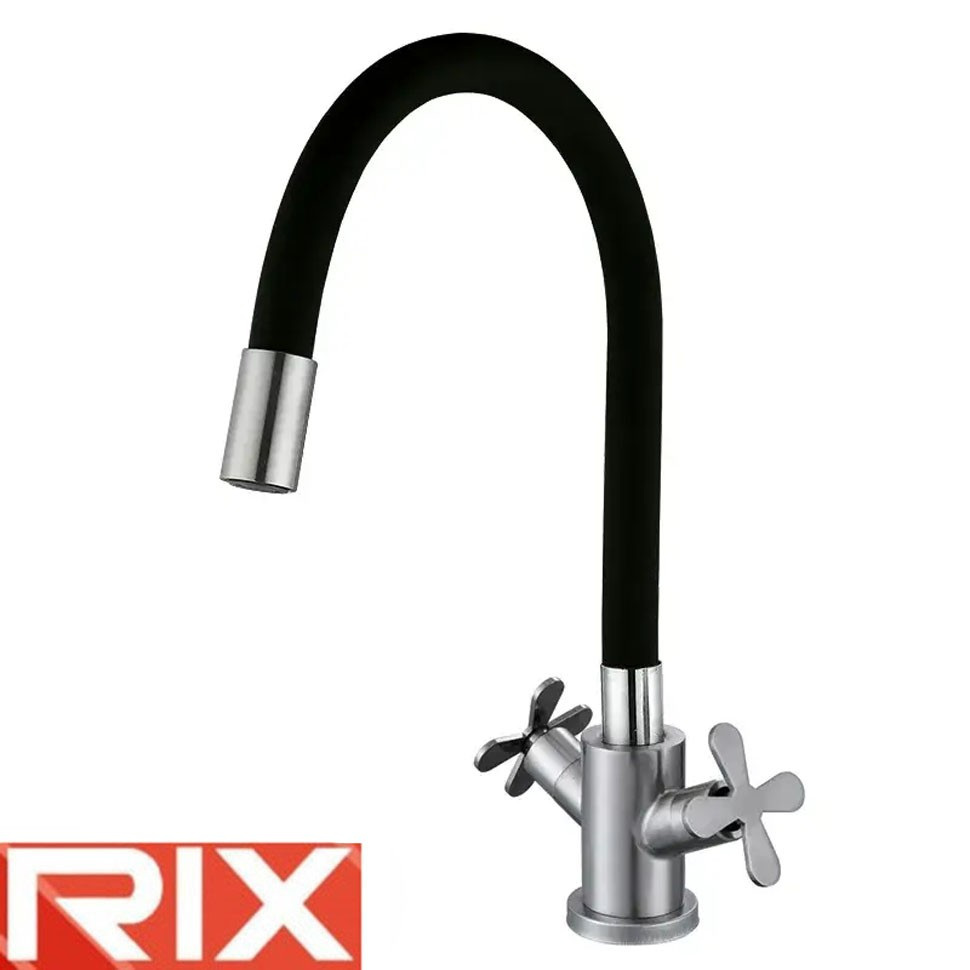 Змішувач для кухні Rix GTA (Chr-011) REFLECTOR BLACK виготовлений із високоякісної нержавіючої сталі марки SUS304, що забезпечує його довговічність та стійкість до корозії. Особливістю даної моделі є гнучкий чорний силіконовий вилив, який дозволяє легко спрямовувати потік води в потрібне місце, забезпечуючи додаткову зручність при миття посуду та кухонного приладдя. Дворучковий механізм керування з керамічним картриджем забезпечує плавне і точне регулювання температури та напору води. Змішувач призначений для встановлення на кухонну мийку та має сучасний дизайн, який гармонійно впишеться у будь-який інтер'єр. В комплект входять гнучка підводка, аератор та елементи кріплення, необхідні для встановлення. Гарантія на корпус змішувача складає 30 місяців, на деталі – 12 місяців.