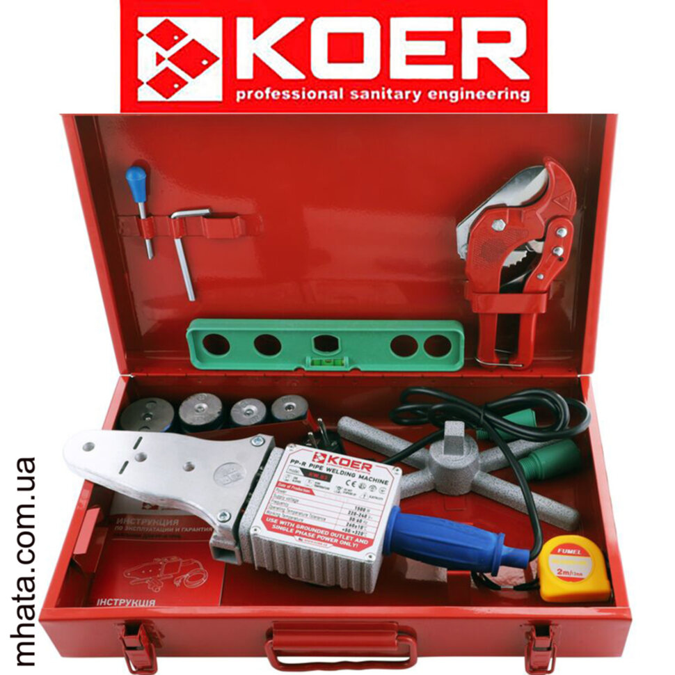 Паяльник для поліпропіленової труби KOER SET-03 (1500Вт,4 насад,ножн,рулетка,2 заглуш,рівень)