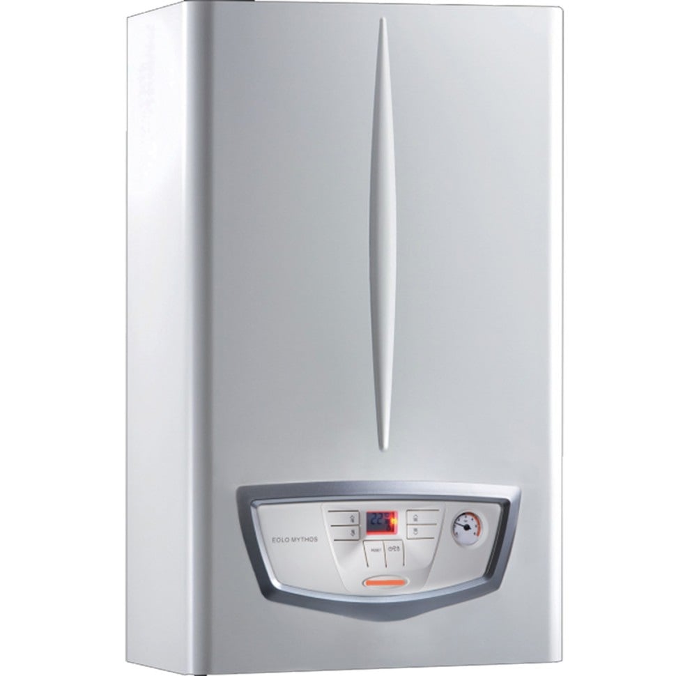 Eolo Mythos– турбований двоконтурний котел від потужністю 24 кВт. Для приготування гарячої води використовується пластинчастий теплообмінник із нержавіючої сталі. Продуктивність гарячої води становить 10,9 л/хв при дельта t=30С.