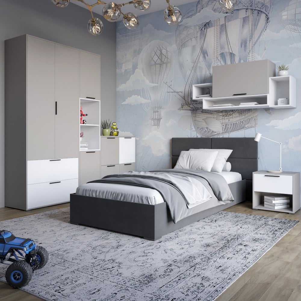 Гарнітур в спальню Lion Краш із 6 елементів Колекція меблів Lion Краш - це стильне та функціональне рішення для вашого інтер'єру. Ліжко оббите високоякісним велюром і укомплектоване ламелями забезпечить комфортний відпочинок. Полиця з одним закритим відсіком - стильний та сучасний акцент колекції. Закритий пенал, який завдяки своїм габаритам та закритому дизайну ідеально підходить для організації простору. Тумба - мінімалістина і ідеальна для дрібниць і необхідних аксесуарів. Дводверна розстібна шафа — поєднання стильного дизайну та практичності для зберігання речей. Тумба чотиридверна завдяки продуманій конструкції з просторими відділеннями це ідеальний варіант для зберігання великої кількості речей. Матеріал виготовлення Гарнітур виготовлений з ЛДСП SWISS KRONO - високоякісного матеріалу, що відрізняється міцністю, стійкістю до механічних пошкоджень, вологи та високих температур. Це гарантує довговічність меблів та її привабливий зовнішній вигляд. Оббивка ліжка виготовлена з велюру Лілі. Цей матеріал відрізняється м'якістю та приємною текстурою, що створює відчуття затишку та комфорту. Матеріал також відрізняється високою зносостійкістю, що забезпечує його довговічність навіть за інтенсивного використання. Особливості Телескопічні напрямні на ящиках: забезпечують плавний та повний доступ до вмісту ящиків, додаючи зручності у використанні. Продумана ємність: кожен елемент комплекту має достатньо місця для зберігання, допомагаючи ефективно організувати простір. Сучасний дизайн: лаконічний стиль та універсальний колір гармонійно поєднуються з будь-яким інтер'єром. Якісні матеріали: виготовлений з ламінованого ДСП, комплект відрізняється довговічністю, міцністю та простотою у догляді. Розміри: Приліжкова тумба: Ширина: 450 мм Глибина: 320 мм Висота: 430 мм Ліжко: Ширина: 980(1280) мм Глибина: 2140 мм Висота: 820 мм Полиця із закритим відсіком: Ширина: 1250 мм Глибина: 4 2 дверцята: Ширина: 400 мм Глибина: 430 мм Висота: 2000 мм Шафа розстібна дводверна з ящиками: Ширина: 800 мм Глибина: 520 мм Висота: 2000 мм Тумба чотиридверна: Висота: 820 мм Глибина:
