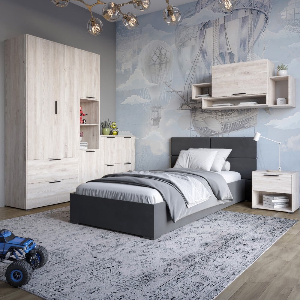 Гарнітур в спальню Lion Краш із 6 елементів Колекція меблів Lion Краш - це стильне та функціональне рішення для вашого інтер'єру. Ліжко оббите високоякісним велюром і укомплектоване ламелями забезпечить комфортний відпочинок. Полиця з одним закритим відсіком - стильний та сучасний акцент колекції. Закритий пенал, який завдяки своїм габаритам та закритому дизайну ідеально підходить для організації простору. Тумба - мінімалістина і ідеальна для дрібниць і необхідних аксесуарів. Дводверна розстібна шафа — поєднання стильного дизайну та практичності для зберігання речей. Тумба чотиридверна завдяки продуманій конструкції з просторими відділеннями це ідеальний варіант для зберігання великої кількості речей. Матеріал виготовлення Гарнітур виготовлений з ЛДСП SWISS KRONO - високоякісного матеріалу, що відрізняється міцністю, стійкістю до механічних пошкоджень, вологи та високих температур. Це гарантує довговічність меблів та її привабливий зовнішній вигляд. Оббивка ліжка виготовлена ​​з велюру Лілі. Цей матеріал відрізняється м'якістю та приємною текстурою, що створює відчуття затишку та комфорту. Матеріал також відрізняється високою зносостійкістю, що забезпечує його довговічність навіть за інтенсивного використання. Особливості Телескопічні напрямні на ящиках: забезпечують плавний та повний доступ до вмісту ящиків, додаючи зручності у використанні. Продумана ємність: кожен елемент комплекту має достатньо місця для зберігання, допомагаючи ефективно організувати простір. Сучасний дизайн: лаконічний стиль та універсальні кольори гармонійно поєднуються з будь-яким інтер'єром. Якісні матеріали: виготовлений з ламінованого ДСП, комплект відрізняється довговічністю, міцністю та простотою у догляді. Розміри: Приліжкова тумба: Ширина: 450 мм Глибина: 320 мм Висота: 430 мм Ліжко: Ширина: 980(1280) мм Глибина: 2140 мм Висота: 820 мм Полиця із закритим відсіком: Ширина: 1250 мм Глибина: 4 2 дверцята: Ширина: 400 мм Глибина: 430 мм Висота: 2000 мм Шафа розстібна дводверна з ящиками: Ширина: 800 мм Глибина: 520 мм Висота: 2000 мм Тумба чотиридверна: Висота: 820 мм Глибина:
