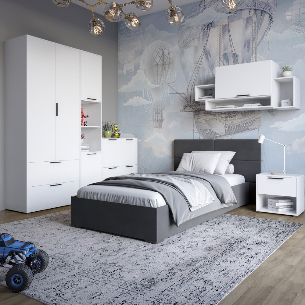 Гарнітур в спальню Lion Краш із 6 елементів Колекція меблів Lion Краш - це стильне та функціональне рішення для вашого інтер'єру. Ліжко оббите високоякісним велюром і укомплектоване ламелями забезпечить комфортний відпочинок. Полиця з одним закритим відсіком - стильний та сучасний акцент колекції. Закритий пенал, який завдяки своїм габаритам та закритому дизайну ідеально підходить для організації простору. Тумба - мінімалістина і ідеальна для дрібниць і необхідних аксесуарів. Дводверна розстібна шафа — поєднання стильного дизайну та практичності для зберігання речей. Тумба чотиридверна завдяки продуманій конструкції з просторими відділеннями це ідеальний варіант для зберігання великої кількості речей. Матеріал виготовлення Гарнітур виготовлений з ЛДСП SWISS KRONO - високоякісного матеріалу, що відрізняється міцністю, стійкістю до механічних пошкоджень, вологи та високих температур. Це гарантує довговічність меблів та її привабливий зовнішній вигляд. Оббивка ліжка виготовлена ​​з велюру Лілі. Цей матеріал відрізняється м'якістю та приємною текстурою, що створює відчуття затишку та комфорту. Матеріал також відрізняється високою зносостійкістю, що забезпечує його довговічність навіть за інтенсивного використання. Особливості Телескопічні напрямні на ящиках: забезпечують плавний та повний доступ до вмісту ящиків, додаючи зручності у використанні. Продумана ємність: кожен елемент комплекту має достатньо місця для зберігання, допомагаючи ефективно організувати простір. Сучасний дизайн: лаконічний стиль та універсальні кольори гармонійно поєднуються з будь-яким інтер'єром. Якісні матеріали: виготовлений з ламінованого ДСП, комплект відрізняється довговічністю, міцністю та простотою у догляді. Розміри: Приліжкова тумба: Ширина: 450 мм Глибина: 320 мм Висота: 430 мм Ліжко: Ширина: 980(1280) мм Глибина: 2140 мм Висота: 820 мм Полиця із закритим відсіком: Ширина: 1250 мм Глибина: 4 2 дверцята: Ширина: 400 мм Глибина: 430 мм Висота: 2000 мм Шафа розстібна дводверна з ящиками: Ширина: 800 мм Глибина: 520 мм Висота: 2000 мм Тумба чотиридверна: Висота: 820 мм Глибина:
