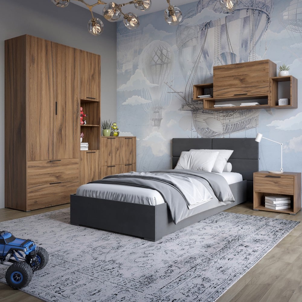 Гарнітур в спальню Lion Краш із 6 елементів Колекція меблів Lion Краш - це стильне та функціональне рішення для вашого інтер'єру. Ліжко оббите високоякісним велюром і укомплектоване ламелями забезпечить комфортний відпочинок. Полиця з одним закритим відсіком - стильний та сучасний акцент колекції. Закритий пенал, який завдяки своїм габаритам та закритому дизайну ідеально підходить для організації простору. Тумба - мінімалістина і ідеальна для дрібниць і необхідних аксесуарів. Дводверна розстібна шафа — поєднання стильного дизайну та практичності для зберігання речей. Тумба чотиридверна завдяки продуманій конструкції з просторими відділеннями це ідеальний варіант для зберігання великої кількості речей. Матеріал виготовлення Гарнітур виготовлений з ЛДСП SWISS KRONO - високоякісного матеріалу, що відрізняється міцністю, стійкістю до механічних пошкоджень, вологи та високих температур. Це гарантує довговічність меблів та її привабливий зовнішній вигляд. Оббивка ліжка виготовлена ​​з велюру Лілі. Цей матеріал відрізняється м'якістю та приємною текстурою, що створює відчуття затишку та комфорту. Матеріал також відрізняється високою зносостійкістю, що забезпечує його довговічність навіть за інтенсивного використання. Особливості Телескопічні напрямні на ящиках: забезпечують плавний та повний доступ до вмісту ящиків, додаючи зручності у використанні. Продумана ємність: кожен елемент комплекту має достатньо місця для зберігання, допомагаючи ефективно організувати простір. Сучасний дизайн: лаконічний стиль та універсальні кольори гармонійно поєднуються з будь-яким інтер'єром. Якісні матеріали: виготовлений з ламінованого ДСП, комплект відрізняється довговічністю, міцністю та простотою у догляді. Розміри: Приліжкова тумба: Ширина: 450 мм Глибина: 320 мм Висота: 430 мм Ліжко: Ширина: 980(1280) мм Глибина: 2140 мм Висота: 820 мм Полиця із закритим відсіком: Ширина: 1250 мм Глибина: 4 2 дверцята: Ширина: 400 мм Глибина: 430 мм Висота: 2000 мм Шафа розстібна дводверна з ящиками: Ширина: 800 мм Глибина: 520 мм Висота: 2000 мм Тумба чотиридверна: Висота: 820 мм Глибина: