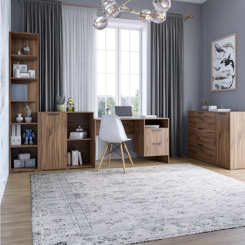 Гарнітур для кімнати Lion Краш із 4 елементів Колекція меблів Lion Краш - це стильне та функціональне рішення для вашого інтер'єру. В неї входять: Комод з 2 закритими полицями та 3 висувними ящиками на телескопічних напрямних, що забезпечують зручну організацію одягу, аксесуарів та інших речей. Тумба, що ідеально підходить для розміщення поряд з ліжком, диваном або письмовим столом, має компактні розміри та місткі відділення. Пенал з відкритими полицями, який чудово підійде для зберігання книг, декоративних предметів та дрібниць, створюючи стильний акцент. Письмовий стіл з ергономічним дизайном, що забезпечує комфортний робочий простір для навчання чи роботи. Короткий мінімалістичний дизайн колекції підкреслює сучасний стиль і дозволяє гармонійно поєднувати елементи між собою. Lion Краш легко впишеться в спальню, вітальню або кабінет, створюючи затишок, порядок та функціональність у вашому будинку. Матеріал виготовлення Гарнітур виготовлений з ЛДСП SWISS KRONO - високоякісного матеріалу, який відрізняється міцністю, стійкістю до механічних пошкоджень, вологи та високих температур. Це гарантує довговічність меблів та її привабливий зовнішній вигляд. Сучасний стиль: мінімалістичний дизайн гармонійно доповнює сучасну естетику інтер'єру. Місткість: кожен елемент меблів оснащений просторими відділеннями, що забезпечують порядок та зручність зберігання. Зручність: оптимальні розміри дозволяють легко інтегрувати меблі як у великі, так і невеликі приміщення. Надійність: високоякісний ЛДСП на телескопічні напрямні ящиків гарантують довговічність та стійкість конструкції. Розміри: Комод: Ширина: 1200 мм Глибина: 430 мм Висота: 860 мм Пенал з відкритими полицями: Ширина: 350 мм Глибина: 500 мм Висота: 2000 мм Письмовий стіл: Ширина: 1250 мм Глибина: 520 мм Висота: 820 мм Глибина: 430 мм Висота: 860 мм