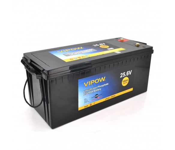 Vipow LiFePO4 25.6V 100Ah – аккумуляторная батарея LiFePO4 типа на базе ВМS платы 80A. При емкости 100Ah и рабочем напряжении 25,6 Вольта аккумулятор находит свое широкое применение, но наиболее часто используется для источников бесперебойного питания, для котлов. Гарантирован высокий ресурс циклов - более 2000. Высокий коэффициент безопасности.