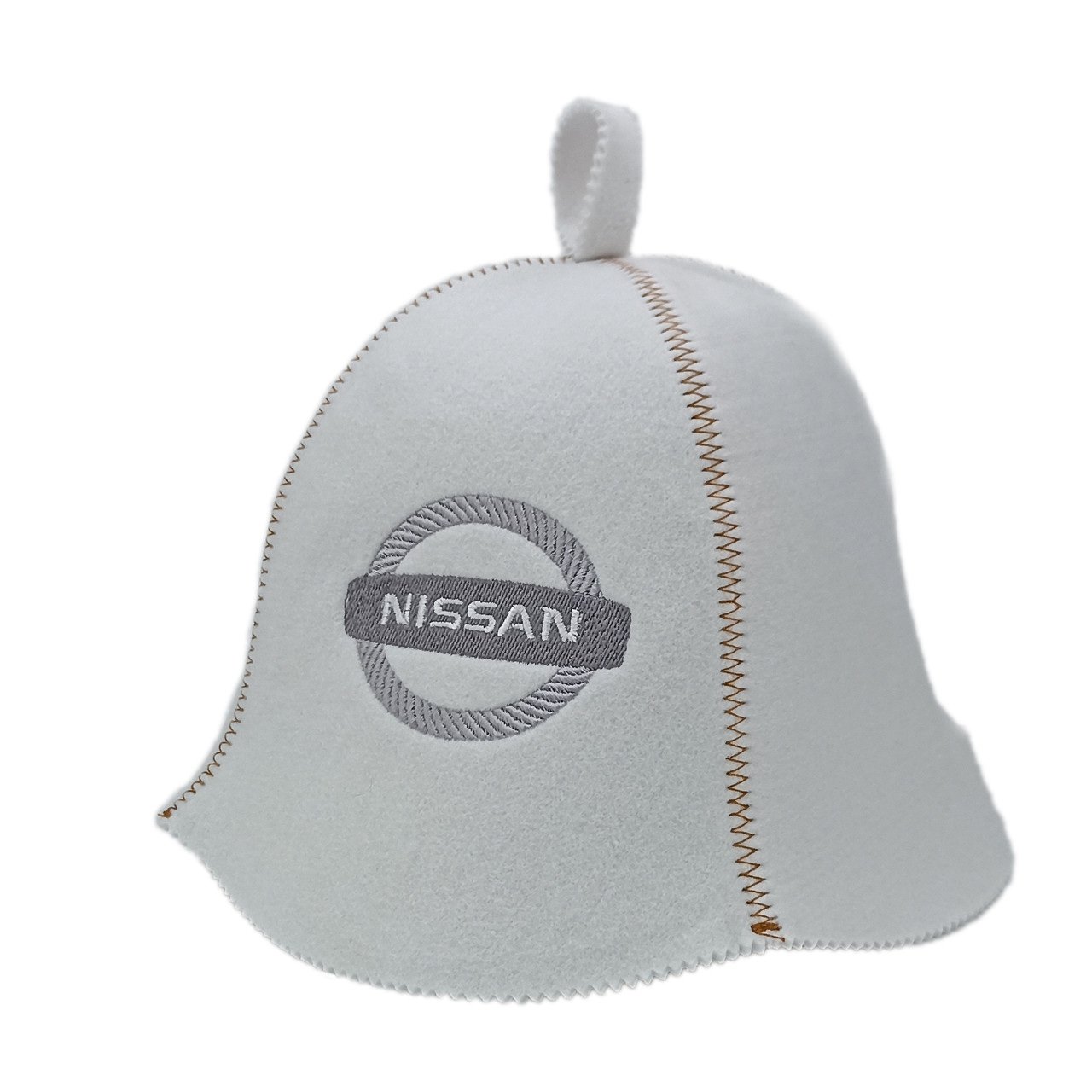 Банная шапка с вышивкой " Nissan" изготовлена из искусственного фетра. Цвет фетра белый.