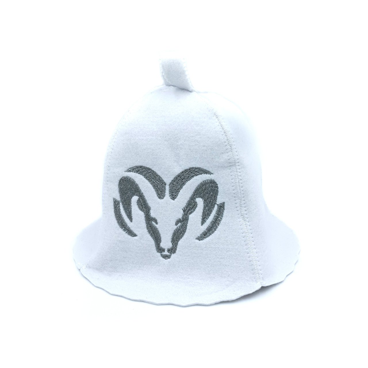 Банная шапка с вышивкой "Dodge" изготовлена из искусственного фетра. Цвет фетра белый.