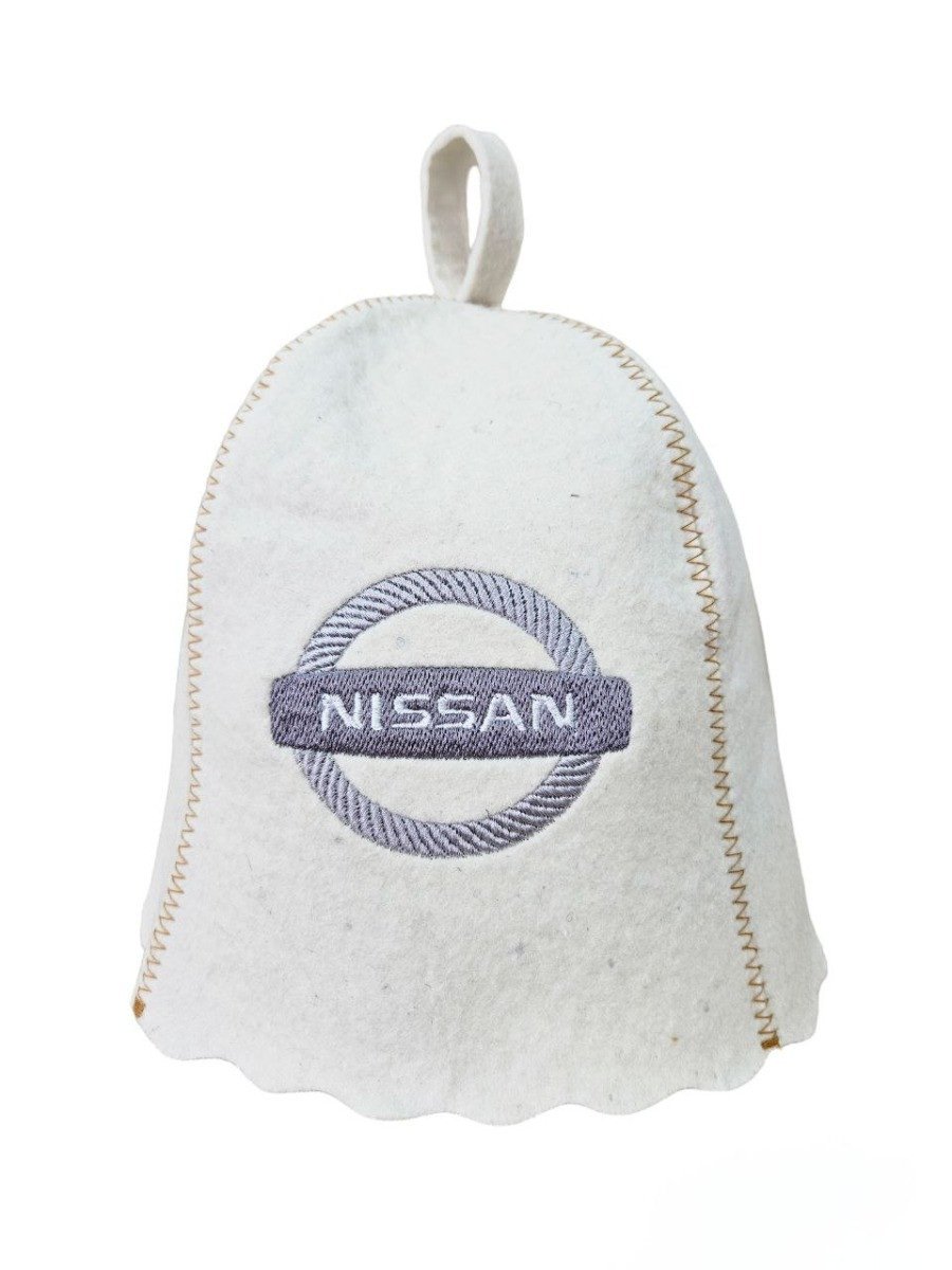 Банная шапка с вышивкой " Nissan" изготовлена из натурального войлока. Цвет войлока белый.