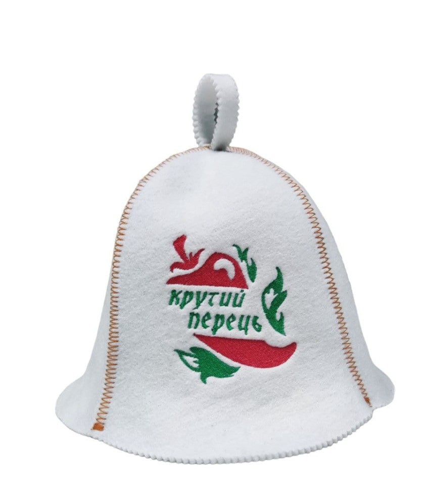 Банная шапка с вышивкой изготовлена из искусственного фетра. Цвет фетра белый.