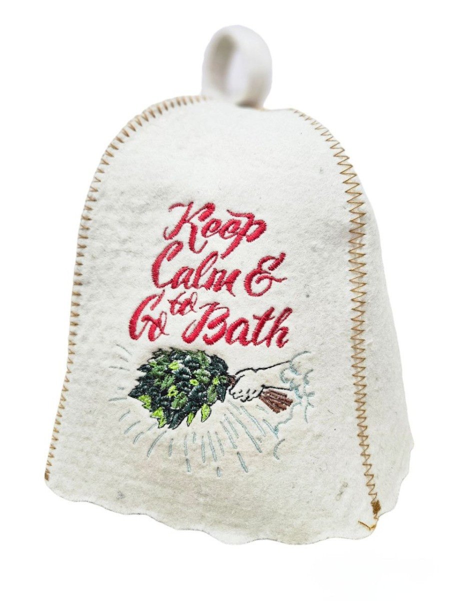 Банная шапка с вышивкой "Keep calm to go bath" изготовлена из натурального войлока, в составе которого овечья шерсть. Цвет белый.