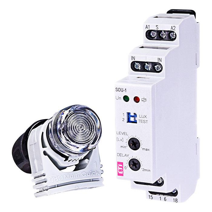 Реле сумеречное SOU-1 UNI ETI служит для управления освещением в зависимости от уровня окружающей освещенности, применяется для уличного и дачного освещения ,освещения реклам, витрин и т.п. Следит за уровнем окружающего освещения с помощью внешнего сенсора и замыкает вход, в зависимости от установленной величины управляющий вход для блокирования выхода, напр. коммитрующим таймером настраиваемый уровень освещения в двух диапазонах: 1 - 100 lx и 100 - 50000 lx настраиваемая задержка времени для устранения влияния кратковременных колебаний освещенности внешний сенсор с защитой IP56 и с приспособлением для крепления на стену/ панель (покрытие и держак сенсора в комплекте поставки).