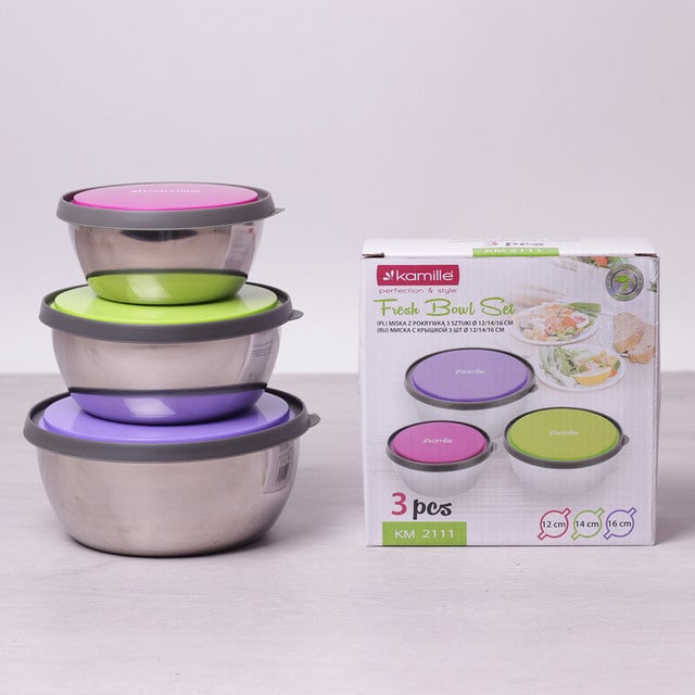 Набор емкостей для хранения продуктов из нержавеющей стали с пластиковыми крышками, которые плотно прилегают, обеспечивают герметичность.
