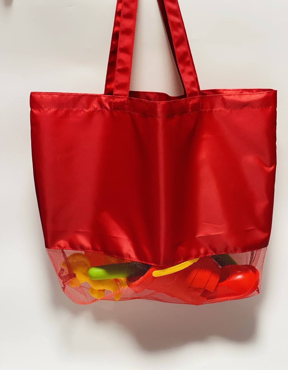 Дно сумки сделано из прочной сетки, сквозь которую песок с игрушек высыпается по пути домой.