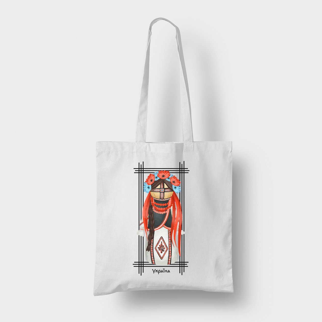 Эко-сумка шоппер с этническим принтом "Кукла-мотанка. Мотанка. Motanka doll. Украина. Ukraine" Кавун Бежевый
