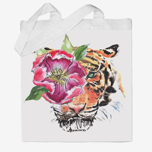 Эко-сумка шоппер с принтом Тигр и белый цветок Кавун Бежевый