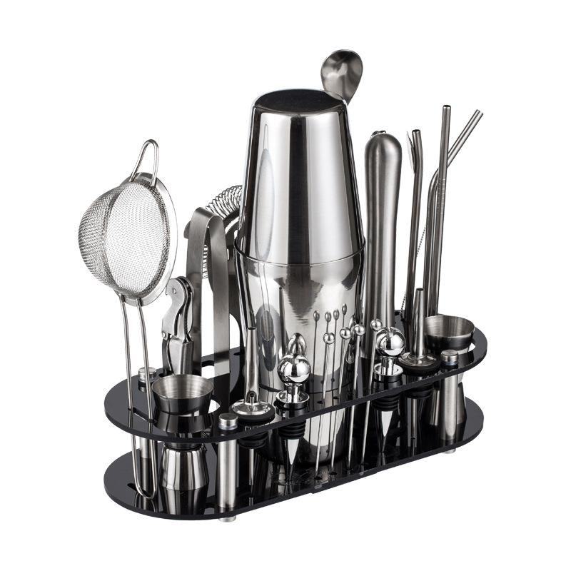 Набор для бара 23 в 1 для приготовления коктейлей изготовлен из высококачественной нержавеющей стали и имеет подставку.