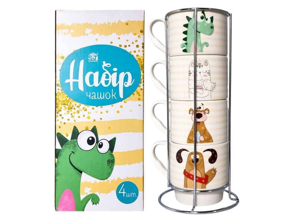 Набор чашек (4х320 мл) на металлической стойке от торговой марки S&T идеально подходит для повседневного использования. Чашки изготовлены из экологически чистого, качественного фарфора белого цвета с рисунком.