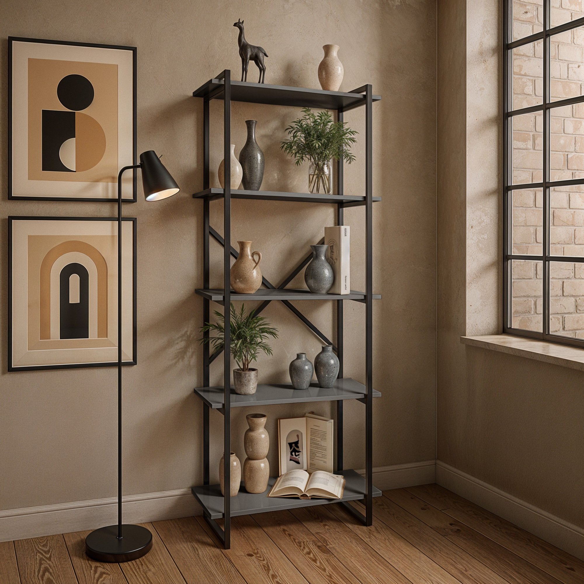 Прочный металлический каркас, усиленный крестовиной, обеспечивает устойчивость и надёжность. Пять открытых полок позволяют удобно размещать книги, элементы декора, коробки или другие вещи без ощущения загромождённости.