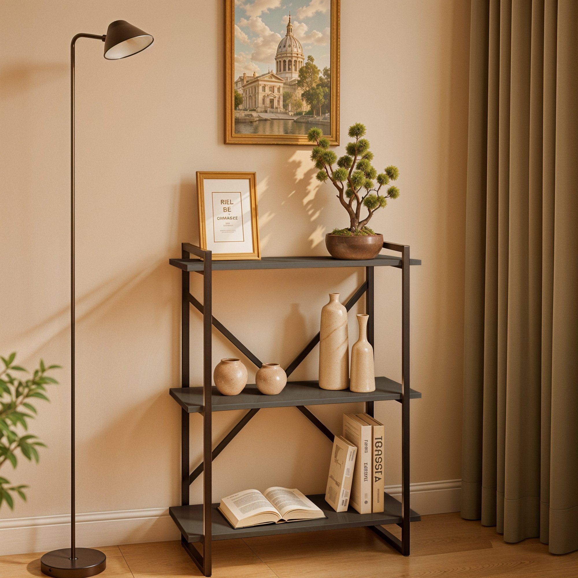 Прочный металлический каркас, усиленный крестовиной, обеспечивает устойчивость и надёжность. Открытые полки позволяют удобно размещать книги, элементы декора, коробки или другие вещи без ощущения загромождённости.