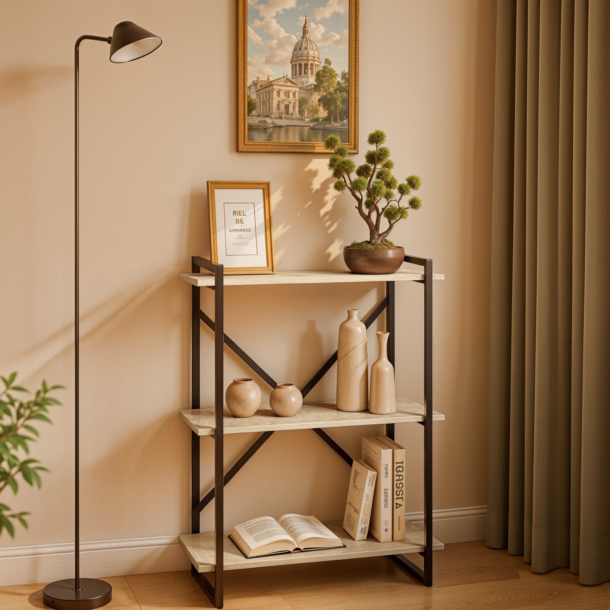 Прочный металлический каркас, усиленный крестовиной, обеспечивает устойчивость и надёжность. Открытые полки позволяют удобно размещать книги, элементы декора, коробки или другие вещи без ощущения загромождённости.