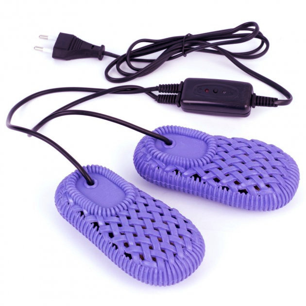 Электрическая сушилка для обуви представлена в виде двух фиолетовых тапочек (пластмассовых корпусов), в которых находятся нагревательные элементы, позволяющие высушить и обогреть мокрую обувь.
