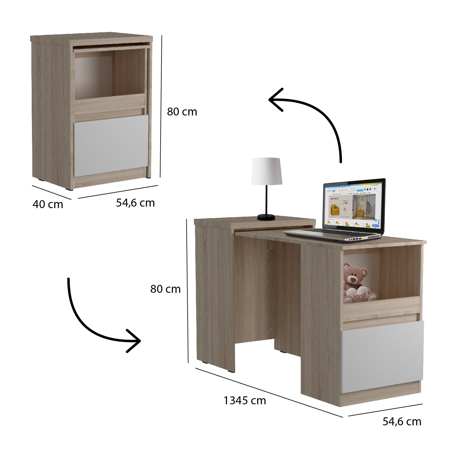 Стіл-трансформер Smart/Смарт 2Стіл-трансформер Смарт 2 - це ідеальне рішення для тих, хто цінує функціональність та ергономічність в інтер'єрі. Цей багатофункціональний стіл легко трансформується з компактної тумби у повноцінний робочий стіл, що робить його незамінним в умовах обмеженого простору.Характеристики:Розміри:У складеному стані: 546х400х800 ммУ розкладеному стані: 1345х546х800 ммМатеріал:Корпус і фасади виготовлені з ламінованої деревостружкової плити (ЛДСП) товщиною 16 мм, що відповідає класу екологічності Е1.Кришка тумби виконана з ЛДСП товщиною 32 мм з протиударною кромкою, що забезпечує довговічність і стійкість до механічних пошкоджень.Механізм:Оснащений шумопоглинаючими гумовими роликами, що забезпечують плавний і безшумний рух при трансформації.Наповнення:Вбудована відкрита полиця надає зручне місце для зберігання необхідних предметів.Розпашний фасад приховує додаткові відсіки для зберігання, підтримуючи порядок і чистоту в приміщенні.Стіл-трансформер Смарт 2 гармонійно впишеться в будь-який інтер'єр, поєднуючи в собі стильний дизайн та практичність. Це ідеальний вибір для квартир-студій, невеликих офісів або дитячих кімнат, де кожен сантиметр простору на вагу золота.