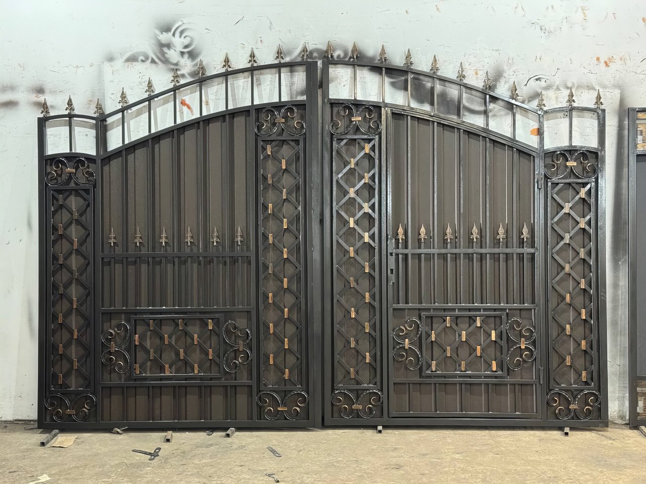 Кованые ворота с калиткой и пиками Код: А-01290(1) Мы изготовим ворота индивидуально по вашим размерам за 4 рабочих дня. Наши ворота производятся на современном оборудовании специалистами нашей компании, что гарантирует скорость и качество. Уличные ворота из профнастила отлично подходят для обустройства въезда во двор частного дома. Классические конструкции не зря пользуются спросом на протяжении нескольких веков: они хорошо выполняют свои функции, оставаясь простыми и удобными в использовании. Изделие может иметь любую форму и дизайн: из-за его технических особенностей ограничений в возможностях декорирования практически нет. БЕСПЛАТНАЯ доставка по всей Украине! (Доставка курьером до Вашего дома, в любой город/село Украины.) По желанию заказчика калитка может быть справой или с левой стороны. Стандартные размеры: Ворота: 3.4м х 1.7м по столбикам. Калитка: 0.9м х 1.7м по столбикам. Также мы можем изготовить ворота индивидуально по размерам заказчика. Цвет профнастила по выбору! Наша компания является одним из самых больших производств на рынке Украины. Для просчета ворот по Вашим размерам звоните +380 (96) 536 41 01