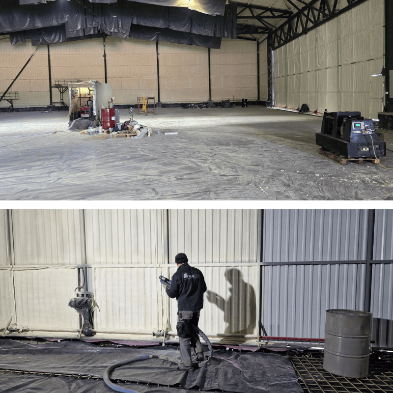Утеплення складів і виробничих цехів пінополіуретаном (ППУ) — це найефективніший спосіб забезпечити стабільну температуру, зменшити витрати на опалення та захистити приміщення від конденсату. ППУ створює безшовний теплоізоляційний шар, який щільно прилягає до металу, бетону або сендвіч-панелей, заповнюючи всі щілини та нерівності.