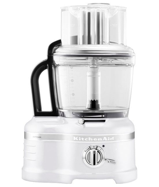 Кухонный комбайн - процессор KitchenAid 5KFP1644EFP Artisan, 4 л, морозный жемчуг Кухонный комбайн KitchenAid – ваш идеальный помощник. В отличие от других кухонных приборов данной категории, кухонный комбайн - процессор отличается достаточно компактными габаритами и, одновременно, вместительностью - объем чаши составляет четыре литра. Два режима скорости (700-1600 об/мин) позволяют выбрать подходящий, в зависимости от вида работы. Характеризуется рядом достоинств, среди которых: крепкий, надежный корпус из высококачественных материалов, удобная, устойчивая к повреждениям чаша с поликарбоната, мощный двигатель, прочные рабочие диски и универсальные ножи, простота в управлении и широкий спектр функции. Лучший кухонный комбайн KitchenAid 5KFP1644EFP Artisan поможет вам без излишних усилий и экономя время, измельчить, нашинковать, нарезать ломтиками, кубиками или кусочками любые виды овощей, фруктов и ягод, а также орехи и зелень, взбить сливки, яйца, крем, и даже замесить тесто. Соковыжималка для цитрусовых может гарантировать вам полезный фреш каждое утро. Диск для нарезки пармезана и измельчения льда будет очень полезным при приготовлении салатов или коктейлей. Крышка рабочей камеры оснащена широкой трубкой для подачи продуктов, что обеспечит возможность обрабатывать пищевые продукты целыми или нарезанными крупными ломтиками. Для мелких продуктов предусмотрен специальный двухсекционный толкатель. Наличие специального инструмента (лопатки) для очистки, позволит с легкостью удалить пищевые загрязнения со стенок камеры и крышки. Нет больше необходимости использовать всевозможные терки, мясорубки и другие мелкие измельчители, достаточно процессор кухонный KitchenAid 5KFP1644EFP Artisan купить и наслаждаться его высоким качеством и широкой функциональностью, которая незамедлительно понадобится вам на кухне. Для совершения маленьких кулинарных шедевров, необходимо приобрести кухонный комбайн, цена и качество которого удостоверят вас в целесообразности покупки. Наш Интернет-магазин он же официальный сайт KitchenAid гарантирует не только достойный уровень обслуживания и высококачественные товары, но и удобную доставку. Основные преимущества кухонного комбайна Система Exactslice Комбайн укомплектован шинковальным диском с возможностью регулировки толщины нарезаемых ломтиков. Просто перемещайте специальный рычаг на корпусе комбайна вправо или влево, выбирайте необходимое положение для желаемого результата. Получите полный контроль за процессом с минимальными затратами времени и усилий. Нарезка кубиками Комбайн способен быстро нарезать продукты кубиками 8х8 мм. Если необходимо нарезать кубиками сразу несколько разных продуктов в одну большую 4-х литровую чашу комбайна, сначала используйте мягкие ингредиенты, а затем более плотные. Оставшиеся в конце нарезки кубики в насадке можно очень просто извлечь, используя специальный аксессуар в комплекте. Герметичная крышка с защитным отключением Крышка плотно прилегает к стенкам комбайна, предотвращая разлет сыпучих ингредиентов и брызг. Комбайн автоматически выключится при снятии чаши, крышки или при полном извлечении большого толкателя, обеспечивая вашу безопасность. В комбайне предусмотрена малая камера объемом 1 л для механической обработки небольших объемов продуктов. Например, орехов, трав и зелени, цедры фрук