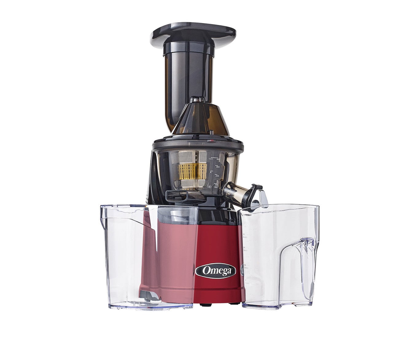 Omega Juicer MMV-702R (red) шнековая соковыжималка Omega Juicer MMV-702 MegaMouth – одна из лучших шнековых соковыжималок с вертикальной загрузкой. Она может измельчить целые плоды без их нарезки. Работает мощно, но тихо. Соковыжималка дает прекрасный выход сока, сохраняя в нем максимум витаминов и ферментов. Умеет дробить лед, орехи и семена. Другими достоинствами модели являются ее надежность и способность готовить сок очень быстро. Шнековая соковыжималка Omega Juicer MMV-702 MegaMouth делает процесс получения сока на низких скоростях более быстрым. В этой модели традиционное качество Omega сочетается с рядом инновационных функций. Соковыжималка с вертикальной подачей продуктов поможет получить сок просто, быстро и удобно. Горловина подачи продуктов Omega 702 имеет диметр 76 мм – самый большой среди соковыжималок такого класса. В неё легко проходят среднего размера яблоки и апельсины без предварительного измельчения. Покупатель существенно сэкономит время на нарезку и подготовку продуктов. Работа соковыжималки обеспечивается 240-ваттным двигателем переменного тока. Его мощности хватает для того, чтобы соковыжималка без усилия измельчала крупно нарезанные или вообще не нарезанные продукты. Благодаря мощному двигателю и инновационной формы шнека, измельчение происходит быстрее, чем в других соковыжималках. При этом соковыжималка работает невероятно тихо. Порцию сока можно сделать даже поздней ночью или ранним утром, не боясь потревожить отдыхающих родственников и соседей. Модель Omega MMV-702 бережно относится к фруктам и овощам. В соке сохраняется максимум витаминов и ферментов. Устройство прекрасно гомогенизирует (измельчает и перемешивает) продукты. С его помощью можно получить не только однородный сок, но и ореховую пасту, сделать сорбеты и детское пюре. Соковыжималка легко очищается в процессе работы. Интегрированный набор ножей постоянно очищает отжимающее устройство от остатков жмыха, не позволяя ему забиваться. Специальнаый клапан на передней части соковыжималки защищает столешницу от капель сока. Соковыжималка хорошо себя проявляет при работе с разными видами продуктов. Оно справляется с приготовлением вкусных и здоровых соков, сорбетов, орехового молока, измельчением семян и орехов до состояния пасты. В целом порция сока в соковыжималке MMV-702 готовится на 30% быстрее, чем в аналогих моделях. Это становится возможным благодаря мощному двигателю, эффективному шнеку и отсутствию необходимости нарезать овощи перед их использованием. В подающую горловину помещаются мелкие и средние яблоки и апельсины, а крупные плоды придется все же нарезать. Тесты показали, что из 1 кг очищенной моркови средней сочности получается около 490 мл сока. Лишь одна соковыжималка дает больше – модель Sana EUJ-808 (520 мл). Очистка устройства не требует много времени и сил. Сочетая традиционное качество Omega с несколькими инновационными особенностями, соковыжималка Omega MMV-702 MegaMouth – это самая быстрая и удобная соковыжималка холодного отжыма, которую мы тестировали. Широкое горло и двигатель Горловина подачи продуктов составляет в диаметре 76 мм и является самой большой среди шнековых соковыжималок в своем классе. Она может легко перерабатывать целые апельсины и яблоки. Широкая горловина – означает меньше времени, затрачиваемого на резку фруктов и овощей. Двигатель переменного тока 