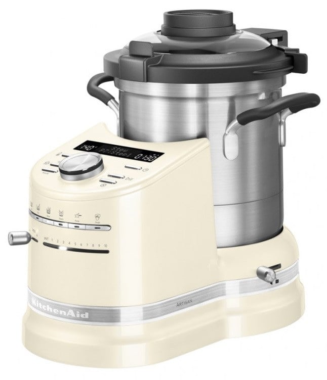 Кулінарний процесор KitchenAid ARTISAN 5KCF0104EAC, 4.5 л, кремовий Уявіть, що на кухні тепер щодня вам допомагає професійний кухар. Він перемішує продукти під час смаження, робить дивовижні страви на парі, готує смачне пюре з овочів і фруктів. І щодня допомагає вам удосконалювати кулінарні навички. Зі стаціонарним процесором KitchenAid ця мрія стає реальністю! Багатофункціональна модель здатна зробити перебування на кухні комфортним. Вам більше не потрібно витрачати час на рутинні процеси — звільніть більше годин для справжньої творчості. Настільний процесор Артисан зробить усе, щоб ваші страви виходили смачнішими з кожним разом. Надійність, зручність і функціональність у кожній деталі Кулінарний процесор забезпечений каструлею на 4,5 л, у якій відбувається змішування інгредієнтів та інші кулінарні чарівництва. Для активації програми приготування вам потрібно лише вибрати режим і встановити параметри — натисніть кнопку, і процесор почне роботу. Ось, на що він здатний: змішує та подрібнює інгредієнти, нарізає їх і пюрує; збиває продукти; готує м'яке або рідке тісто; а також смажить, варить, тушкує і навіть вміє готувати на парі. Процесор із блендером KitchenAid — технічна досконалість, володіння яким перетворює кулінарію на справжнє мистецтво. До того ж до нього є кілька додаткових насадок, які неабияк розширюють функціонал моделі. Процесор Кітчен Ейд — прилад, здатний замінити більшість кухонних приладів. Технічні особливості Такі параметри, як-от температура та швидкість роботи двигуна, встановлюються в приладі автоматично. Користувачеві потрібно лише вибрати програму. Також є режим ручного керування. Каструля 4,5 л із неіржавкої сталі обладнана ручками з покриттям, що захищає від перегрівання. У знімній кришці є отвори, через які можна додавати приправи та інші компоненти. Працює процесор у діапазоні температур від 40 до 140 градусів, забезпечуючи повне збереження корисних мікроелементів та речовин. У подрібнювачі реалізована технологія StirAssist, яка буквально виконує функції кухаря: перемішує та перевертає інгредієнти! Людині не потрібно брати участь у цьому процесі особисто. Кухонна машина Kitchen Aid створена, щоб дарувати радість, підвищувати комфорт і якість життя день у день. Насолоджуйтеся приємними речами, а рутину залиште процесору, купленому в інтернет-магазине Дарим тепло. Режими: Варка: цей режим дасть змогу вам готувати ароматні бульйони та супи, варити джеми та желе, а також будь-які інші страви, для яких потрібна варіння впродовж певного часу. Підсмаженіе: в цьому режимі можна готувати прар-фрай, різні страви азійської кухні, смажити омлети та бекон, а також готувати інші страви, що вимагають підсмажування. Тушкування: універсальна програма для найрізноманітніших страв. Рагу, ризото, рататуй, пудинг, приготовані в режимі тушкування, не займуть багато часу та завжди будуть смачними Варка на пару: пристрій для варіння на парі дає можливість розмістити продукти на кількох рівнях. Ви зможете готувати овочі, рибу, морепродукти та інші делікатні страви без прямого контакту з джерелом нагрівання. Пюрування: цей режим поєднує одночасне нагрівання та подрібнення інгредієнтів. Ідеально підходить для приготування хумусу, крокетів із креветок, мусу з черевної капусти, овочевих і м'ясних страв дитячого харчування. Тесто: поєднання нагрівання т