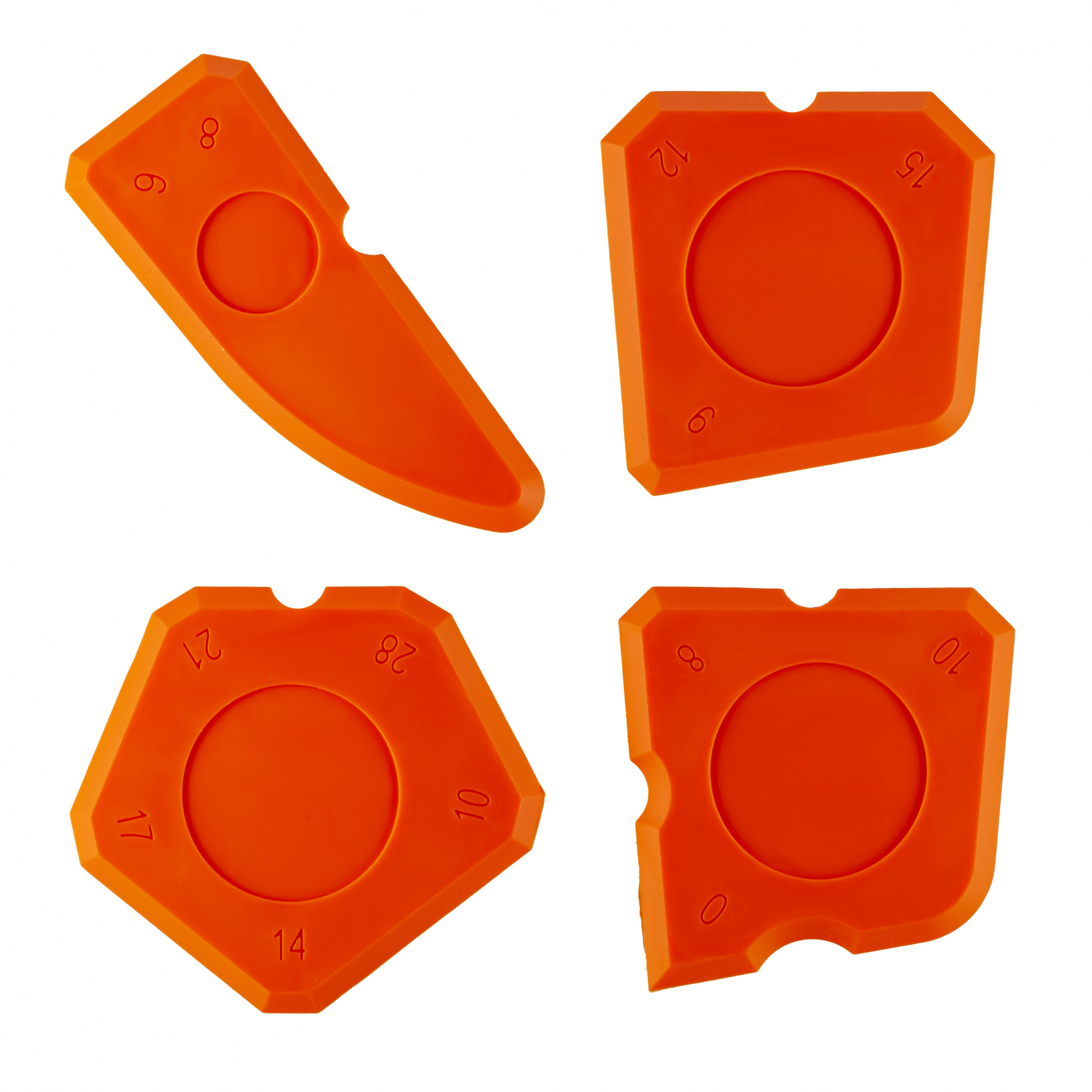 Набір пластикових шпателів для силікону призначений для професійного та побутового використання при нанесенні, розгладжуванні та формуванні силіконових, акрилових або інших герметиків. Ідеально підходить для роботи в місцях з'єднання плитки, ванних кімнат, раковин, вікон, дверей та інших поверхонь. Особливості набору: У комплекті 4 шпателя різної форми: квадратний, п'ятикутний, довгий трикутний та з різними радіусами кутів. Підходить для швів розміром: 0 мм, 6 мм, 8 мм, 10 мм, 12 мм, 14 мм, 15 мм, 17 мм, 21 мм, 28 мм. Забезпечує акуратну та рівномірну обробку швів без надлишків матеріалу. Виготовлені з TPR (термопластичної гуми) синтетичного матеріалу, що поєднує в собі властивості еластичної гуми та пластику стійкого до деформацій. Можна використовувати багато разів – легко очищаються після використання.