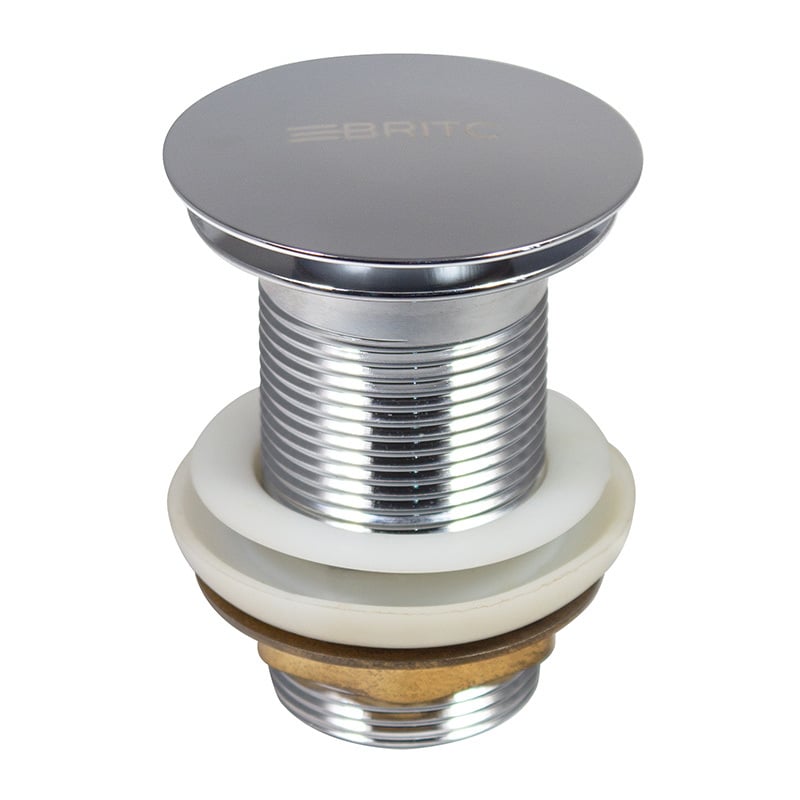 Донний клапан без переливу Britc SS65 призначений для умивальників без переливного отвору. Він забезпечує герметичне перекриття зливу для наповнення раковини водою за необхідності. Такі клапани часто застосовуються в дизайнерських раковинах або моделях, де переливний отвір не передбачений конструкцією.