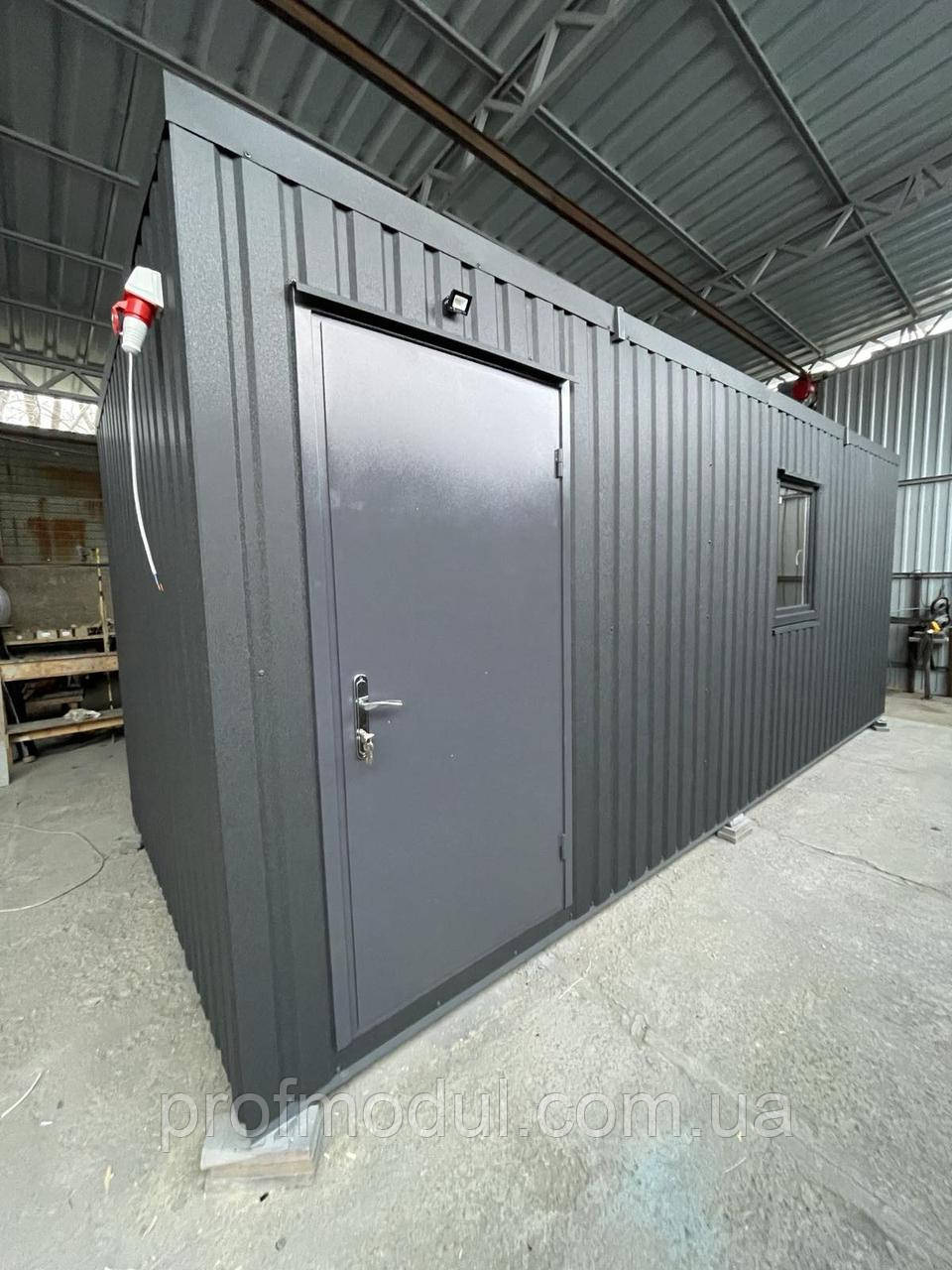 - Несучий каркас из швелера 100*50 мм. В середине наружных стен вертикальные стойки из швелера 100*50 мм с шагом 1200 мм. Между ними поперечные стойки из швелера 100*50 мм по всему периметру каркаса, на высоте 1200 мм от низа пола. В середине периметра потолка -лаги с шагом 1200 мм. В середине периметра пола - лаги с шагом 600 мм. Пол усилен дополнительными лагами. Лицевые элементы каркаса окрашены. - Пол – дно подшито оцинкованным листом 0,5мм, утеплитель 100 мм базальтовая вата, гидробарьер, плита OSB 22 мм, линолеум, плинтус. - Стены – оцинкований профлист ПС 20 с полимерным покрытием RAL 7024 графит толщина 0,45мм. Паро-гидроборарьер, утеплитель 100 мм базальта вата, плита OSB 10 мм. - Поклевка и потолок односкатна, оцинкований профнастил ПК44 товщина 0,45 мм;RAL 9006 серый, паро-гидробьер, утеплитель 100мм базальтовая вата, плита OSB 10 мм. - Входная дверь – металлические 950*2000 мм (металл 1.5 мм., производство Украина, утепленная, имеет врезанный замок с комплектом ключей, – 1 шт. - Окна – металлопластиковые 800*1000 мм, поворотно-откидное – 1 шт, стеклопакет однокамерный. - Электропроводка: внешний штепсель подключения (220V), розетки кабель 3*2,5 мм, освещение кабель 2*1,5мм, внутренний щит с автоматами, розетки двойные - 2 шт, выключатель одноклавишный – 1 шт, LED светильники 36 Вт – 2 шт, проводка скрытая внутри стен,проложенная в металлической гофре.