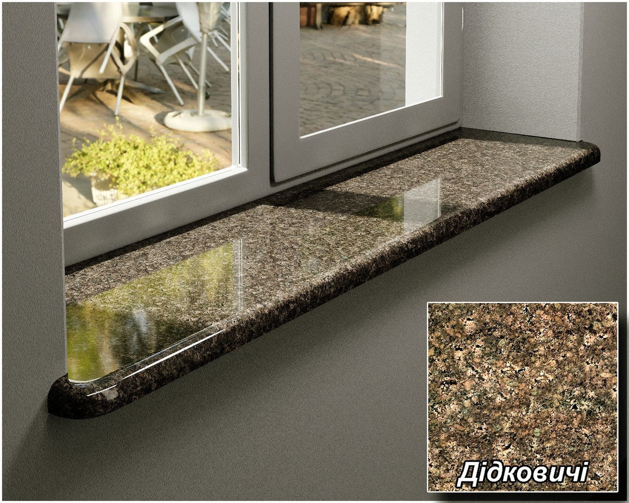 Поліровані гранітні підвіконня коричневого кольору. Виготовляємо по вашим розмірам. Також робимо обробку торця (фаска) в різних варіантах: пряму під 45', заокруглену. При використанні на вулиці можемо робити крапельник по вашому бажанню.