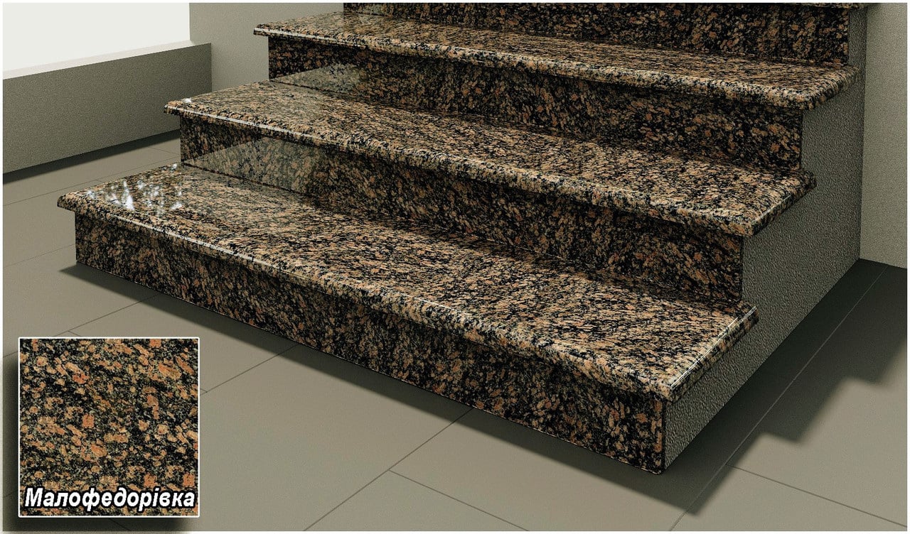 Гранітні сходинки червоно-сірого кольору. Наше підприємство, яке знаходиться в Житомирській області, виготовляє сходинки по вашим індивідуальним розмірам. Сходинки можуть бути як поліровані(як правило всередені приміщень), так і термооброблені - для використання на вулиці. Зазвичай сходинки робляться товщиною 3 см. Але по бажанню замовників ми можемо зробити їх любої товщини. Ми організуємо доставку сходинок по всій Україні попутним транспортом або Новою поштою.