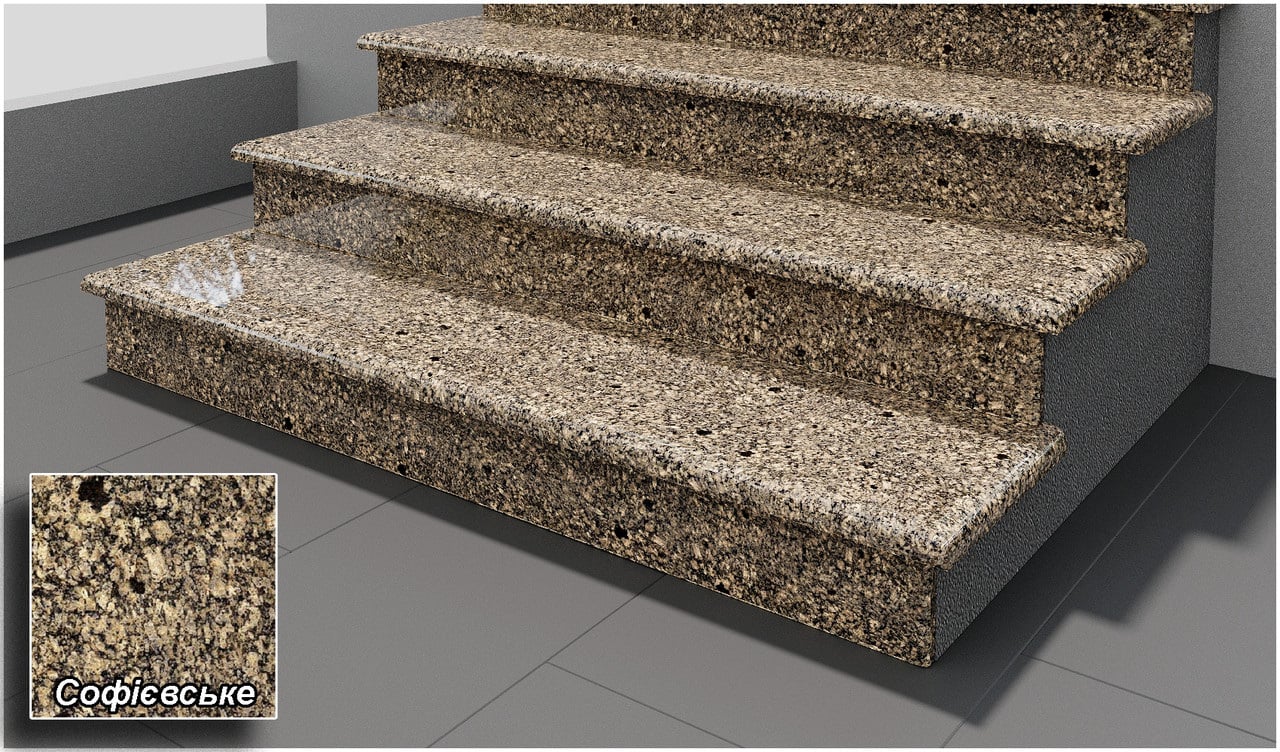 Гранітні сходинки жовтого кольору. Наше підприємство, яке знаходиться в Житомирській області, виготовляє сходинки по вашим індивідуальним розмірам. Сходинки можуть бути як поліровані(як правило всередені приміщень), так і термооброблені - для використання на вулиці. Зазвичай сходинки робляться товщиною 3 см. Але по бажанню замовників ми можемо зробити їх любої товщини. Ми організуємо доставку сходинок по всій Україні попутним транспортом або Новою поштою.